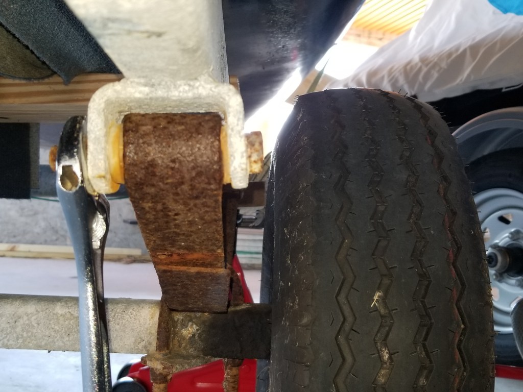 Will replacing my leaf springs for my Spindrift Day Sailer’s trailer be a do it yourself job? Yes, of course, you would not have found this post if it wasn’t. They are available at lots of trailer shops or online. The challenge is to get through the super rusted hardware to remove the leaf springs. Frankly, I was surprised that they survived the journey from New Jersey to New York when I purchased the boat. Fortunately they did. This particular spring style is called a slipper. It has a mild curve on one end, and is bolted through on the other end. So, along with the slipper, I need to get the U-Bolt and hardware, plus the through bolt.