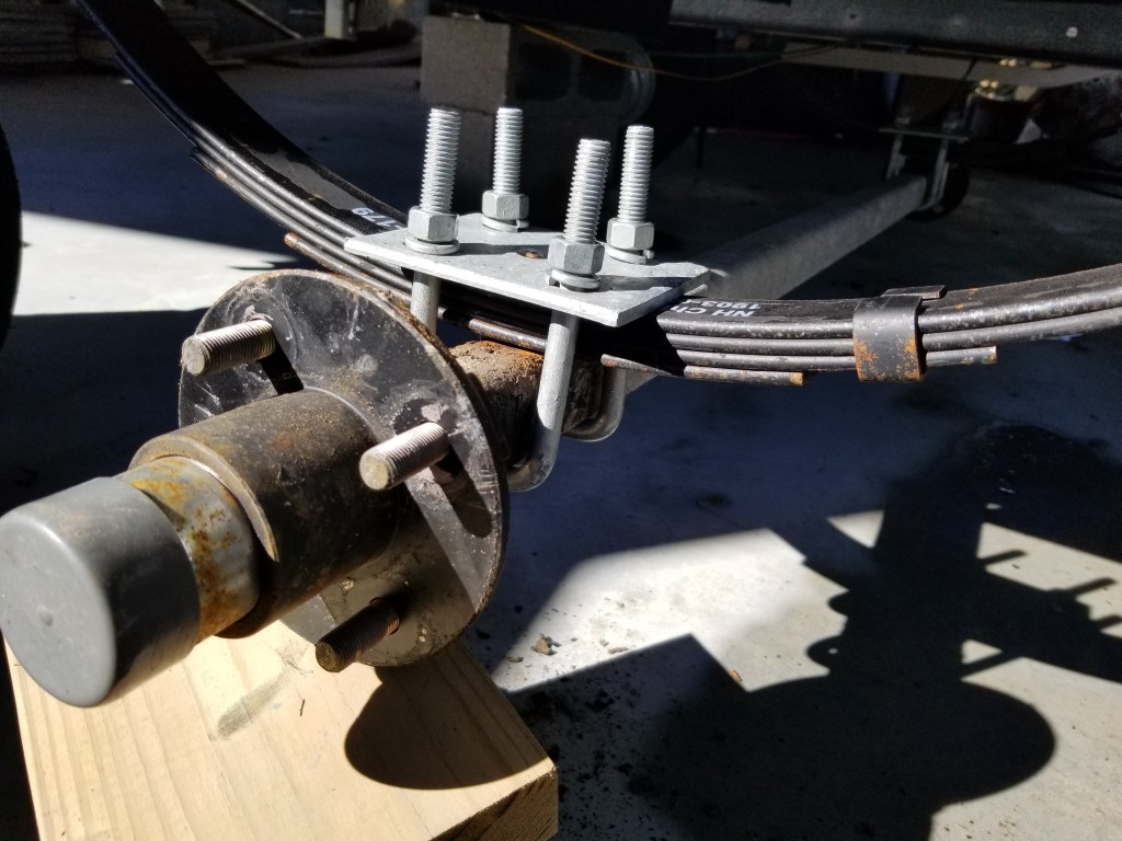 Step 3: Installing the fastening bracket. The fastening hardware was much more robust. However, the axle did not center in the same place as the original spring. This meant that I could not replace just one side and put it all back together or one side of the trailer would be further forward than the other and the trailer would not track straight. In fact, the original mounting hardware would not let me fix the new side so I left that side loosely fitted until I could complete the other side.