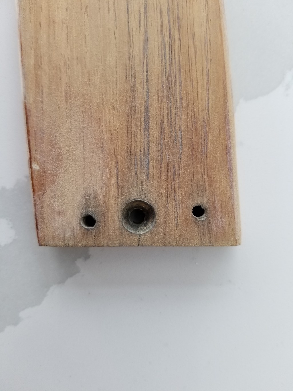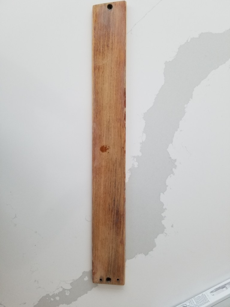 There are a lot of resources that compare varnish and cetol. I won’t go into all the gory details. The bottom line is that this boat will be kept on a trailer, and under the cover of a car port most of the time. It does have weather exposure but not as much as many other boats. Traditional marine varnish requires more prep, more coats, more often. Cetol is a common alternative that requires less prep, less coats, less often. That’s good enough for me. To get started, I started with a small test piece of brightwork to make sure I understood how to strip (sand), clean, and apply the Cetol. Here is what it looked like through each step.