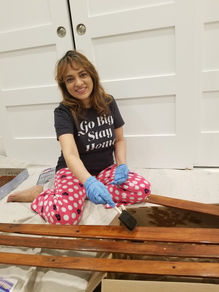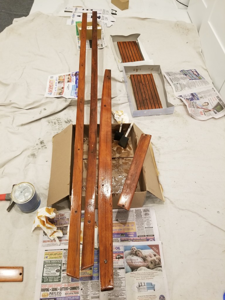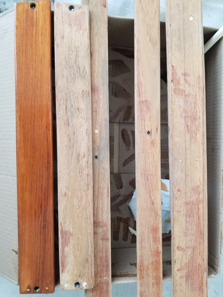 Here are the prepped teak trim planks after cleaning. The test plank is on the left, finished with 2 coats of Cetol. My lovely wife helped apply the finish on the teak trim. It was a pretty quick job and we were able to do it in a bedroom with the door closed and the windows wide open. We used small sponge applicators and that seemed to be a good call. The Cetol is pretty smelly stuff for a few hours. If the temperatures had been above freezing, would definitely prefer to do outdoors. This is how the teak looks after the first coat. Same planks! After it dried, you can definitely see where the porosity of the wood caused an uneven finish. I believe the deeper grooves just absorbed more of the finish. Let’s see it looks after the second coat.