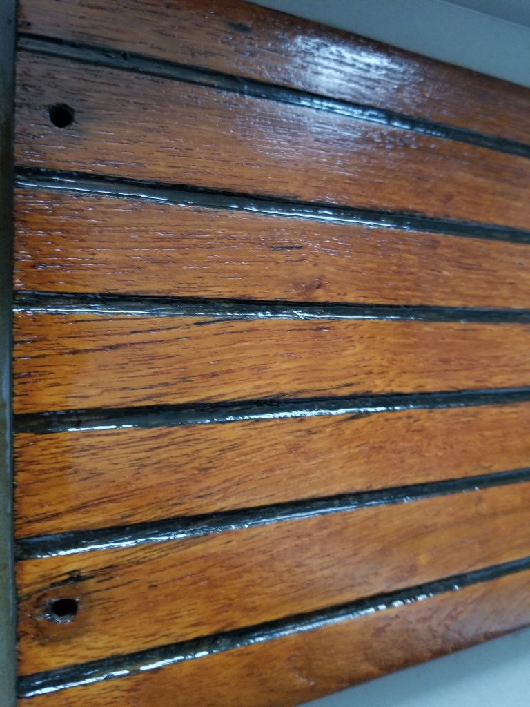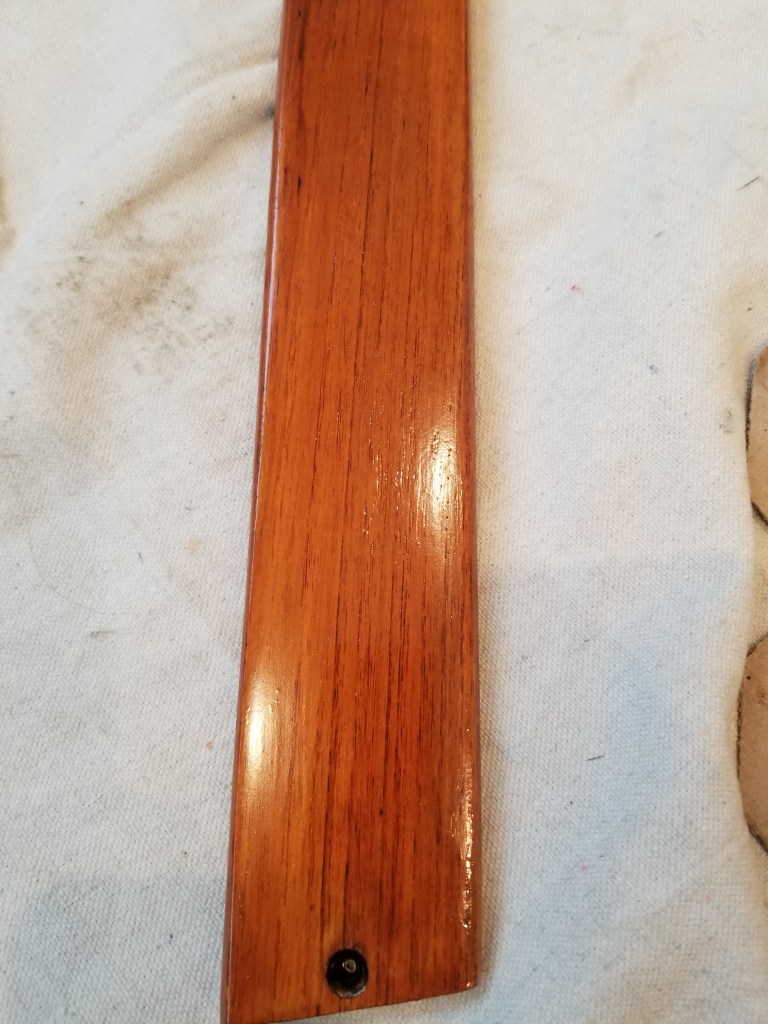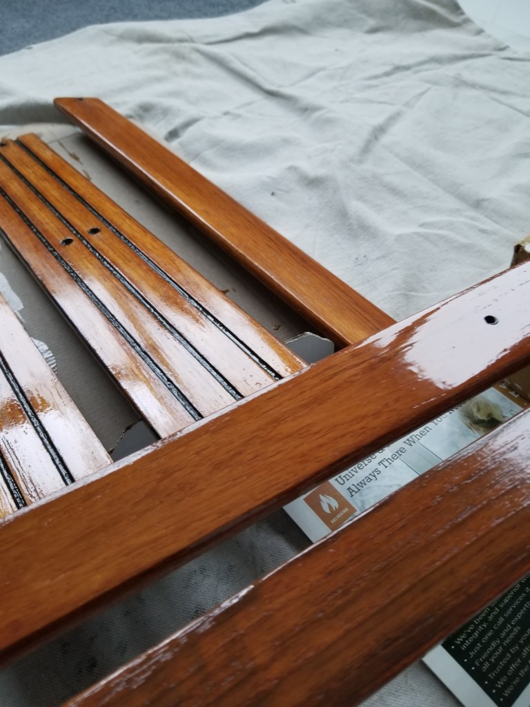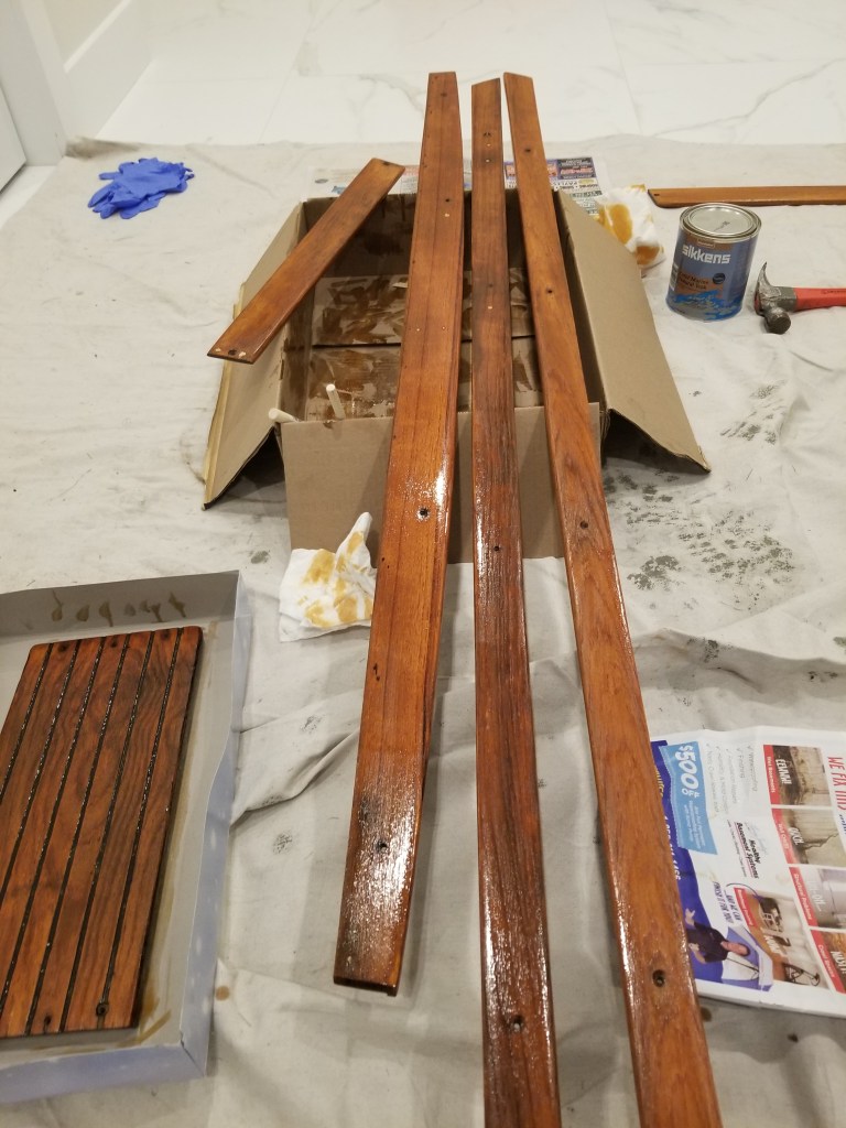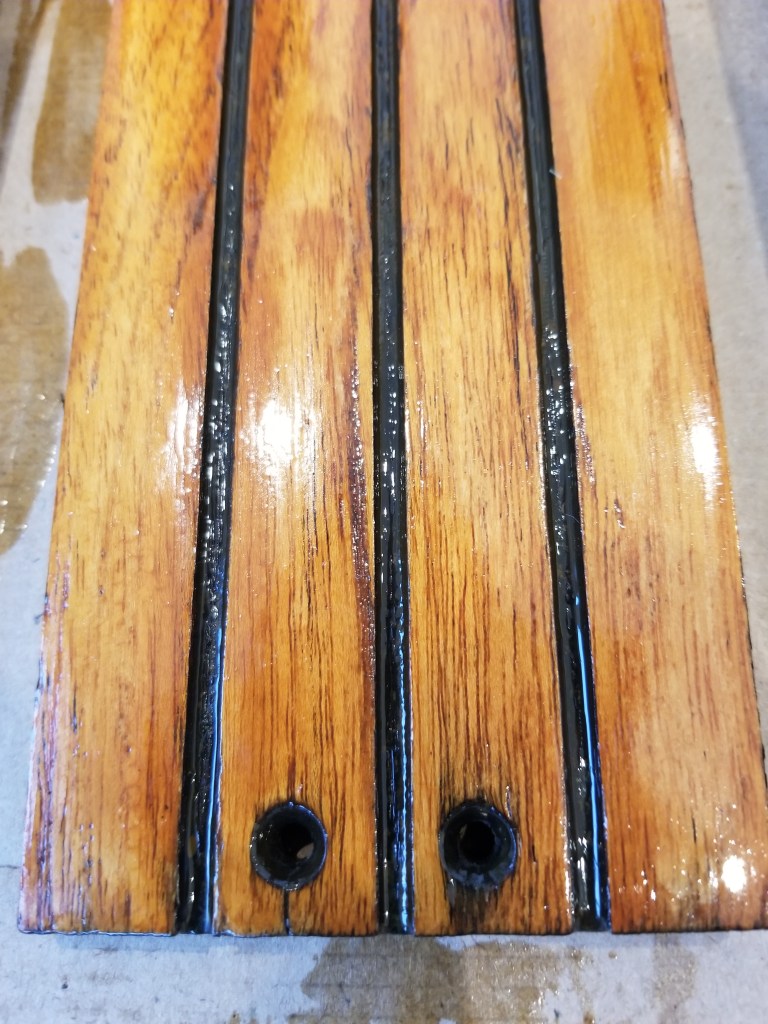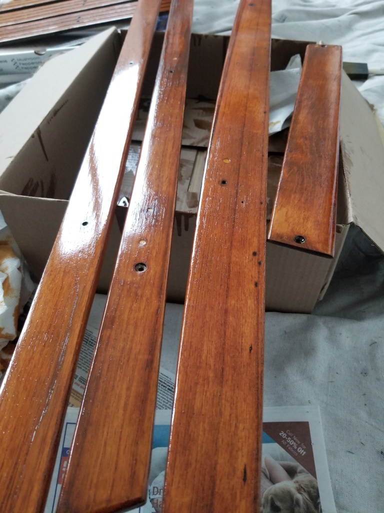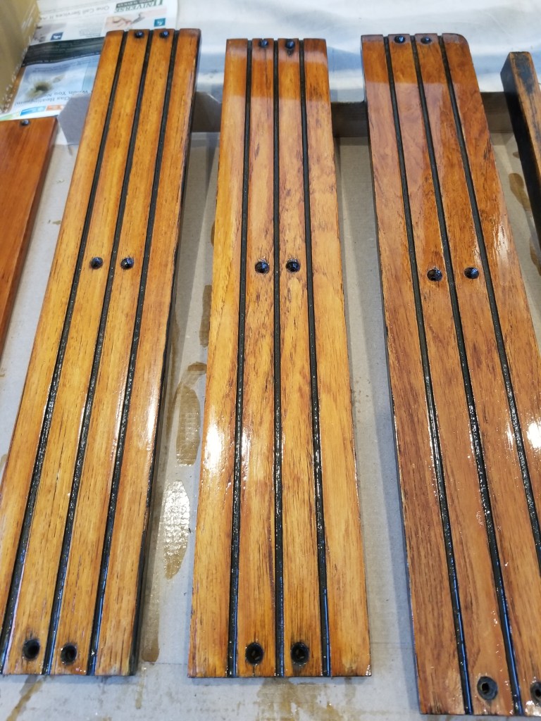 This was the finish after the 1st and 2nd coat. The wood was fairly rough and absorbed a lot of the finish. You can see in the later pictures on this post that after the 3rd coat it really started to smooth out. Here is after the 3rd coat of Cetol Varnish. (ok Cetol is technically not varnish)The bench plank teak really came alive with rich colors and a smooth finish. Planning for one more coat on these as they are one of the main sitting surfaces.Closeup of the bench plank teak after three coats. The nicest outcome of all the teak trim pieces. Am guessing this one had less overall exposure due to how the boat was stored by previous owner. The teak cross braces for the Spindrift Day Sailer look much better without chips and dings, and with a consistent finish.After about a day, the Cetol finish starts to dry to a nice, rich, smooth finish. Close up of the finished Spindrift cockpit trim and transom pieces.