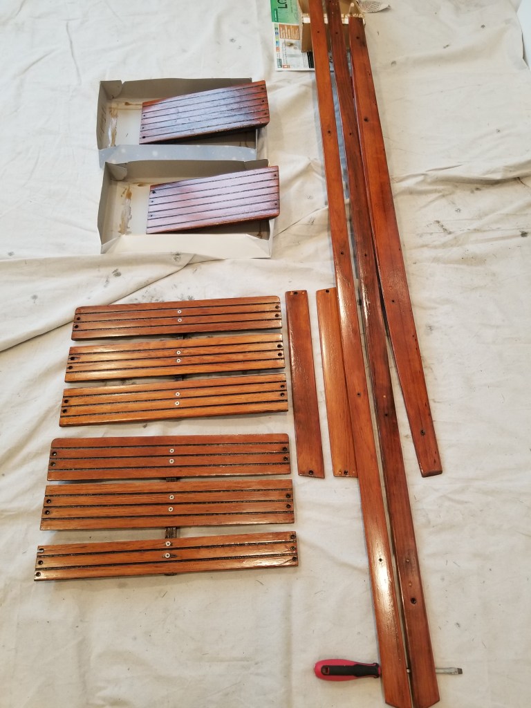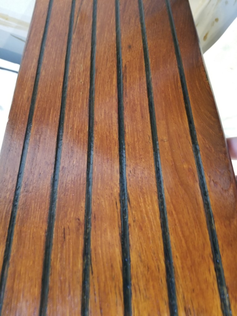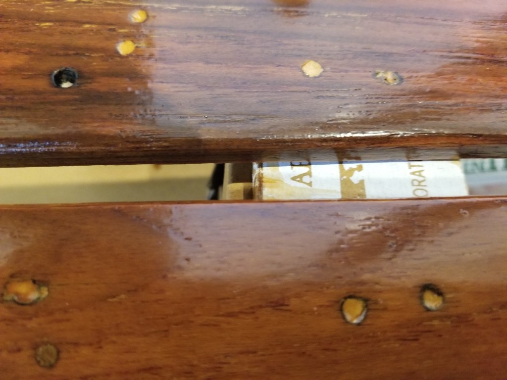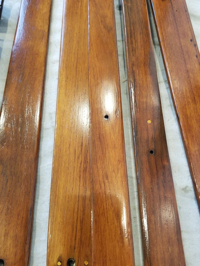 After 3 coats, and a 4th coat of touchup, here is the finished result. I’m quite happy with the sheen, and the pieces look substantially nicer.The more weathered teak came out a lot darker than the less weathered wood. It leads me to think some of the wood has been replaced. Potentially, we’re looking at a mix of Mohogany and Teak? The main cabin trim pieces were pretty clean and smooth. I debated a third coat of Cetol, and glad I decided to apply it. Since I was working on a ventilated indoor space, I could just leave it all on where it dried, and come back a few days later to apply the subsequent coat. The Cross members were in good shape. I did not attempt to repaint the black, as it was well attached. I just used the sponge brush to smush the Cetol in there for al of the indented areas, and then smoothed out the rest of the surface. I would rate my hole patching as below average. I used a plastic wood filler off the shelf from Home Depot. While the whiteness of the color did come down a bit after 3 coats, it still is a poor match, and the surface did not stay smooth. I would have liked to experiment with mixing the plastic wood with the varnish to see if I could get a decent tint. Just about all the tint options I found were for interior wood so not suitable. I also try using the teak dust from sanding, and mixing it with the plastic wood to borrow from a recipe advocated by some of the traditionalists. It just made it a globby mess that was hard to work with and too dry to really adhere well to the hole. This piece was the nicest finished product. Basically, the end result quality depends largely on the initial state of the wood. That said, I am super pleased with how much I was able bring the wood back.This is the an example of the original wood before sanding and prep.